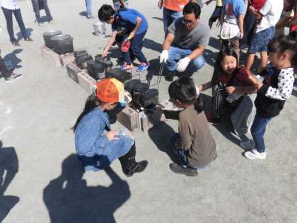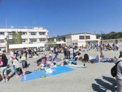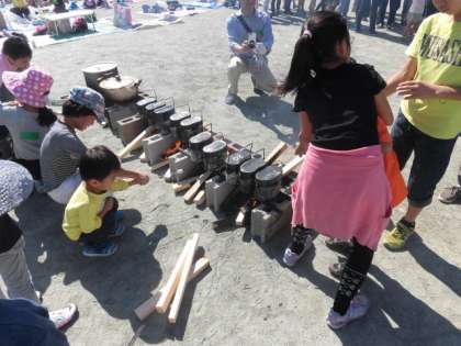 かまどをつくり、順調に作業を進めています。途中、子どもたちは防災倉庫を見学し、どんな避難に必要なものが用意されているか見たり、マシュマロを焼いて食べたりしながら出来上がるのを心待ちにしています。