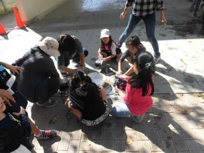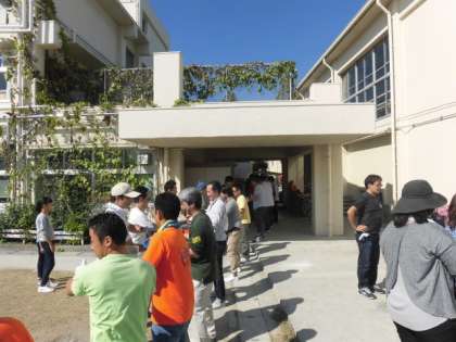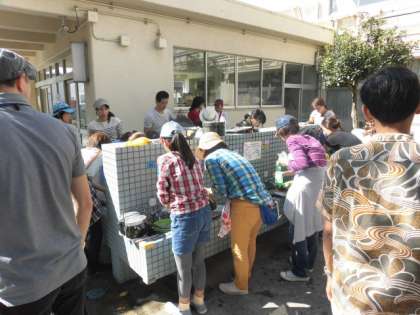 みんなでおいしくいただいた後は、後片付けです。大人の人と一緒に飯盒を洗ったりできることをしています。重いブロックは、お父さん方がブロックリレーで体育館の裏に運んでくれました。後片付けをしっかりとすることも飯ごう炊さんではとても大事です。ご協力ありがとうございました。