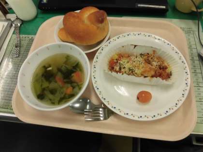 今日の給食は、セサミパン・ポテトグラタン・野菜スープ・ぶどう です。