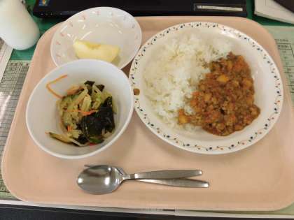 今日の給食は、ひよこ豆のカレーライス・わかめサラダ・リンゴです。