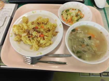 今日の給食は、パエリアふう・ベーコンと野菜のスープ・フレンチサラダ です。