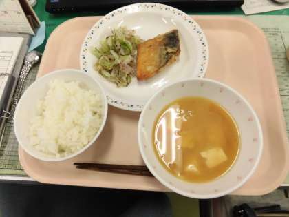 今日の給食は、ごはん・鯖の竜田上げ・キャベツのゆかりあえ・みそしる です。