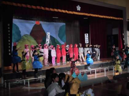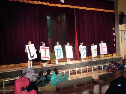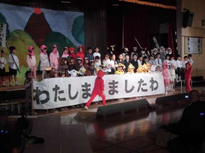 1年生は、反対言葉が楽しい「レエカリクッヒ」を演じました。クラスを超えて同じ役同士で何度も練習を重ねるうちに、互いの顔と台詞を覚え、友達の輪が広がりました。自分の演技で観客が笑ってくれたことがとても嬉しかったようです。そして、2年生から6年生の劇を見て大興奮。初めての学芸会を大いに楽しんだ2日間でした。