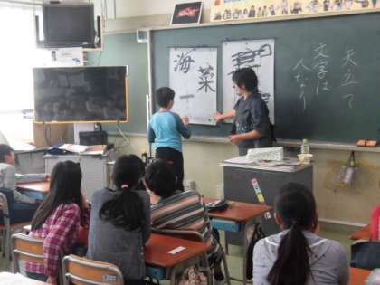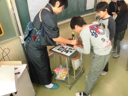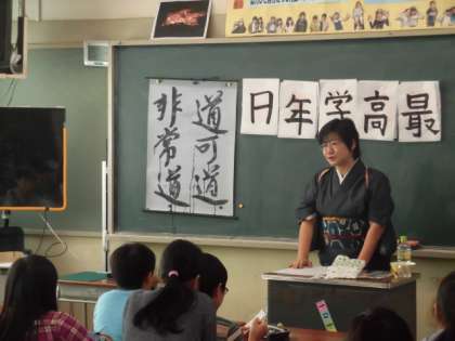 日本語で、日本の伝統文化について学習する5年生。日本には、いろいろな「道」がありますが、今日は「書道」の鈴木ゆう子先生から教えていただきました。日本の伝統について体験を交えながら教えていただきました。5ヶ月後には6年生になる5年生。最後には、リレー形式で「最高学年 日」の字を完成させました。