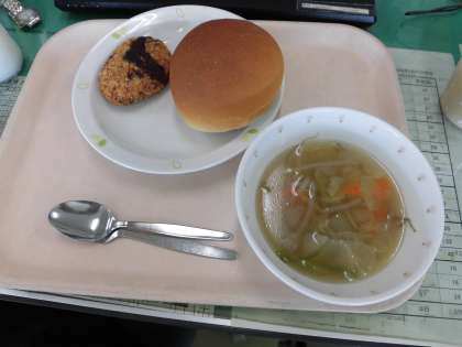 今日の給食は、まるパン コロッケ 野菜スープ です。