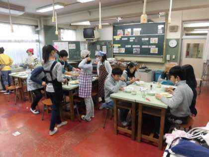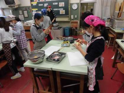 6年生が調理実習を行いました。「ポテトサラダ」と「ジャーマンポテト」を班で強直して作りました。包丁を使ってのじゃがいもの皮むき。お家でお手伝いをしている人は、上手に向いていました。初めての人も慎重に頑張って向いていました。出来上がりは、とてもおいしくできました。