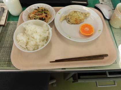 今日の給食は、ごはん てんぷら(ししゃも・さつまいも)