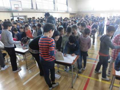 2学期最後のゲーム集会を行いました。クラスみんなで協力して書き上げる「お絵かきリレー」、学級のカラーがあらわれる作品ができあがりました。2学期も楽しいゲーム集会を企画してくれた集会委員のみなさん、ありがとうございました。
