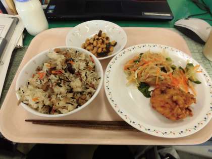 今日の給食は、ひじきごはん 手作り薩摩揚げ いとかんてんと野菜の和え物 昆布豆