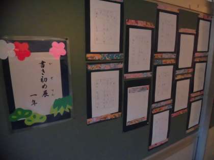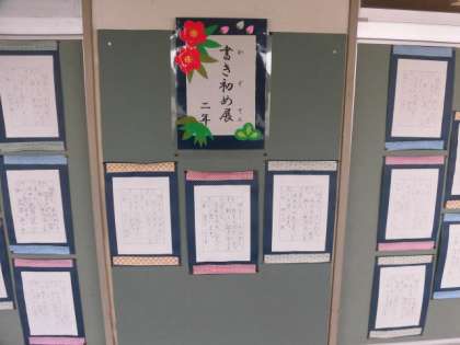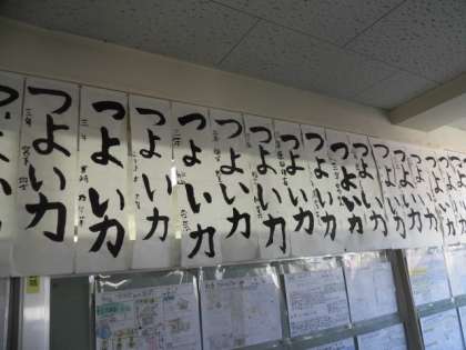 3学期になって学校で行った書き初めの作品を各教室の廊下に展示してあります。ご来校の折はぜひご覧ください。1・2年生は硬筆です。3年生は、初めて毛筆で「つよい力」を書きました。