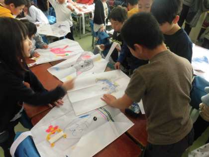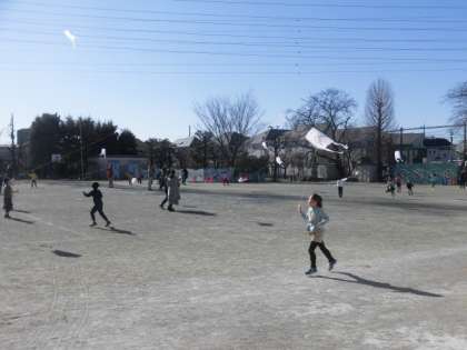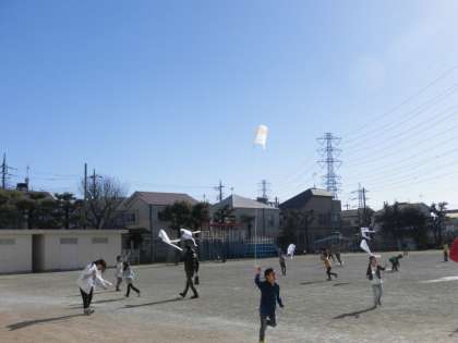 良い天気の中、広い校庭で2年生が凧あげをしました。自分で絵を描いた世界に一つだけの凧を気持ちよくあげていました。保護者の方にもお手伝いいただき上手に凧あげができました。ありがとうございました。