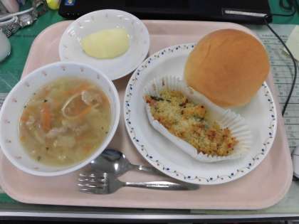 今日の給食は、まるパン 魚のガーリック焼き ヌードルスープ くだもの です。