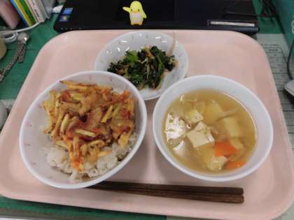 今日の給食は、かき揚げ丼 野菜のゴマダレかけ 豆腐汁 です。