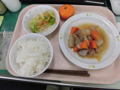 今日の給食は、 ごはん ぶたにくとごぼうのごはん 即席漬け みかん です。