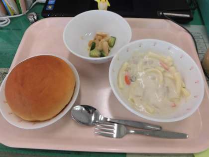 今日の給食は、ミルクパン マカロニのクリームに ビーンズサラダ