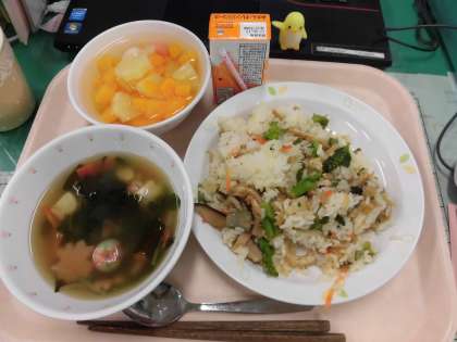 今日の給食は、なのはなずし すましじる フルーツ白玉 です。今日は、ひな祭りメニューにしました。