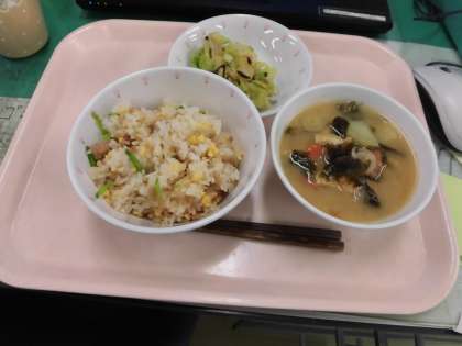 今日の給食は、三食丼 キャベツの塩昆布 味噌汁 です。