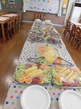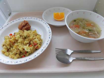 今日の給食は、カレーピラフ 鶏肉の唐揚げ ベーコンと野菜のスープ