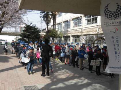 満開の桜の中、子どもたちが学校に戻ってきました。新しい学年になった喜びからか、いつもより早く来る子が多かったです。明日からは、8時5分から15分の登校時間に合わせて登校しましょう。3年生、5年生はクラス替えの用紙をもらってから始業式に臨みました。