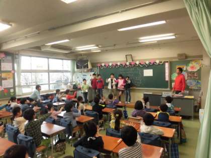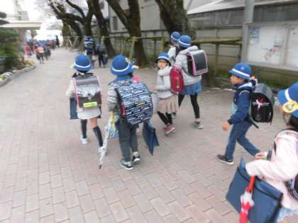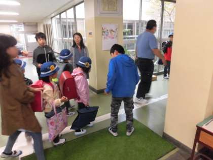 入学式を終えた1年生は、今日から登校開始です。ランドセルに防災ずきん、荷物もありますが元気に登校してきました。登校した後は、6年生のお世話も受けながら自分でくつをはきかえ、教室での準備です。少しずつ早くできるようがんばりましょう。