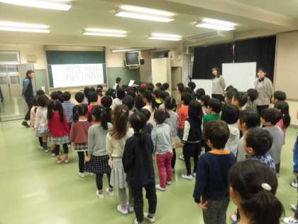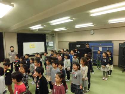 14日(木)に1年生をむかえる会がある1年生。これまでは、それぞれの教室で練習してきた歌を今日は集会室で3クラスいっしょに練習しました。とっても元気な声が響いてきました。この調子なら本番も上手に歌えるでしょう。