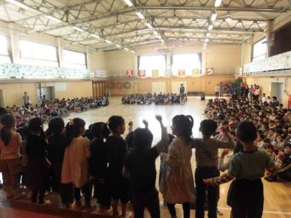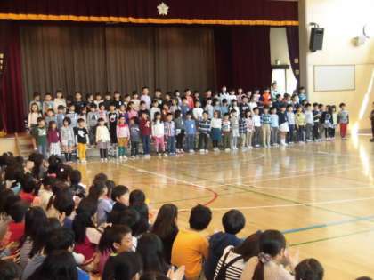 昨年度の代表委員が考えた学校クイズや名刺交換ゲームを楽しんだあとは、1年生全員で「ドキドキドン!1年生」を元気に歌いました。大きな歌声が体育館いっぱいに響きました。たくさん練習した成果が表れていました。