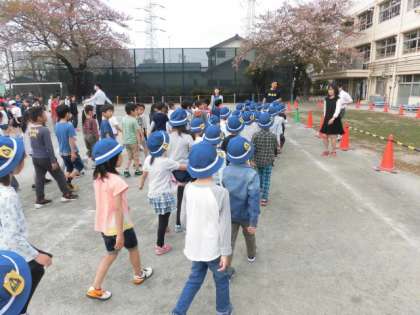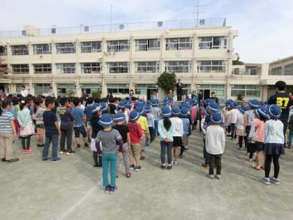 今日から1年生も全校朝会に参加です。前の人の頭をしっかりとみて整列も上手にできました。校長先生の話もしっかりと聞くことができました。朝会が終わると昇降口まで行進です。しっかりと手と足を上げて行進も上手にできました。来週の全校朝会も頑張りましょう。