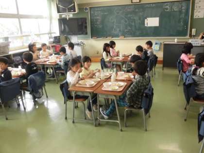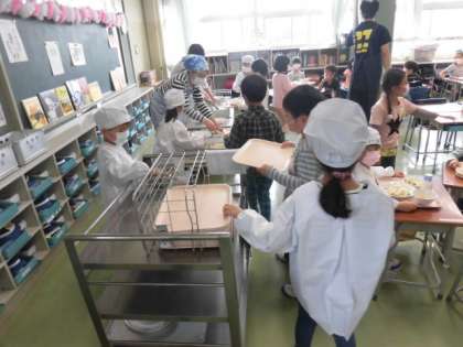 今日から1年生の給食が始まりました。先生の話をしっかりと聞いて、当番さんは配膳をがんばりました。トレイを持って自分の分の給食を席まで慎重に運ぶ姿がみられました。牛乳もこぼさないように丁寧にあけていました。もぐもぐタイムはおしゃべりをしないで、そのあとは楽しくお話しする約束も守れました。初めての給食は「とってもおいしかった」そうです。