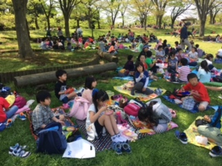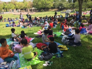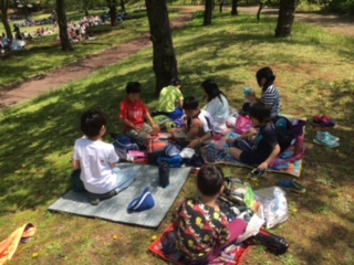全てのグループが無事ゴールしました。これから楽しみにしていたお弁当です。先週は教室でしたが今日は、広い芝生で気持ちよく食べています。準備ありがとうございました。