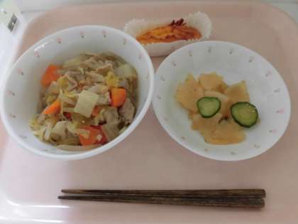 今日の給食は、みそラーメン 大根のちゅうか味 キャロットケーキです。