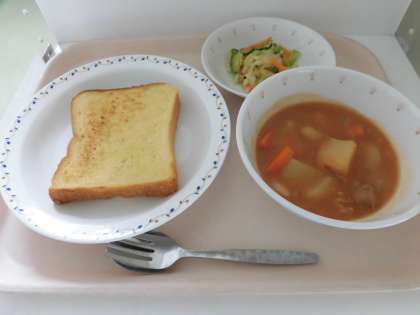 今日の給食は、 フレンチトースト ビーンズシチュー 野菜のイタリアンドレッシングかけ です。