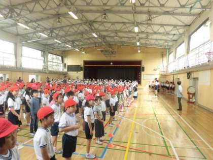 次は、音楽係の伴奏で、開会式で歌う「運動会の歌」、閉会式で歌う「校歌」の練習です。指揮者をしっかりと見ながら歌いました。1年生も校歌を覚えて元気に歌っていました。運動会本番は、体育館ではなく校庭歌います。今日よりもっと元気な声を響かせましょう。