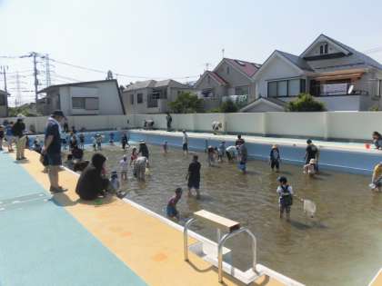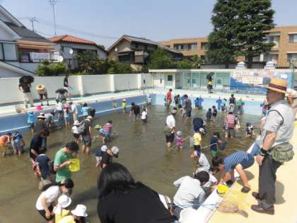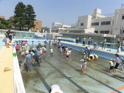 例年行われている「烏山みずとみどりの会」主催の「水生生物観察会〜プール開き前にヤゴ救出作戦!!」をプールで行いました。とてもいい天気の中、たくさんの子どもたち保護者の方が参加してくれました。水を抜いたプールに、苔で転ばないように慎重に入り、ヤゴを網ですくいました。たくさんのヤゴを見つけた子もたくさんいました。取ったヤゴは家で大事にトンボになるまで育てます。いただいた育て方のプリントをよく読んで大事に育てましょう。