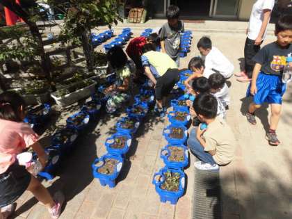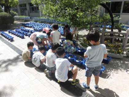 1年生がまいた朝顔の芽が出てきました。毎日水やりを忘れずに大切に育てていきましょう。観察もしっかりしましょう。