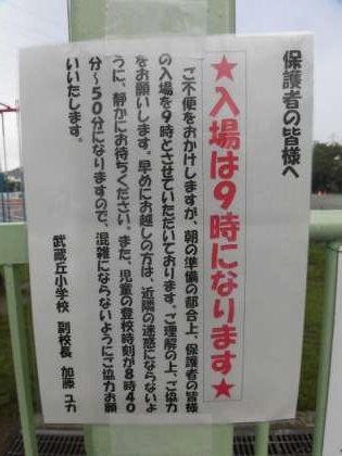 本日の運動会は、昨日お知らせしたとおり、午前9時30分入場開始で実施します。なお、保護者の方の保護者席の入場は9時からとさせていただきます。