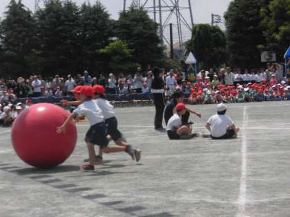 2年生の競技「どすこい!大玉」 3人で協力して大きな球を転がします。直線は早く進みますが、回るのは少し難しいです。