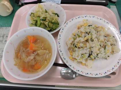 今日の給食は、青菜のチャーハン 中華スープ 中華サラダ です。