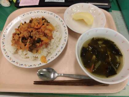 今日の給食は、キムチどん わかめスープ りんご です。