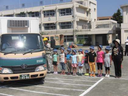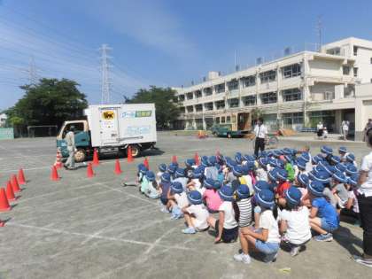 ヤマト運輸の方を招いて2年生が交通安全教室を行いました。町でよくみかける集配車が実際に学校の校庭にきました。実際に車を動かして内輪差について学んだり、車に乗って視覚を体験したりしながら学びました。今日の体験を生かして交通事故にあわないよう気をつけていきましょう。