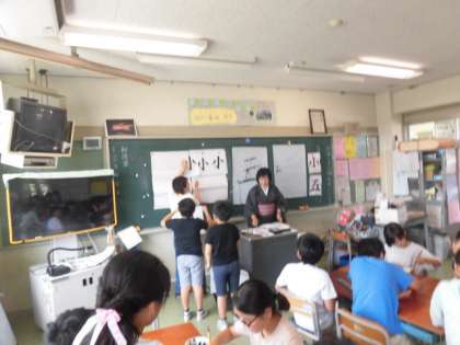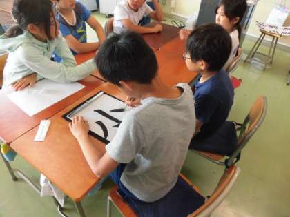 総合的な学習の時間で「日本の伝統文化」について調べていく5年生。今日は、書き初めや夏休みの地域教室でご指導いただいている鈴木ゆうこ先生にきていただき、「書道」を中心に日本のさまざまな「道」に共通することなどのお話をうかがったり、グループで「小五」の字を完成させたりしました。