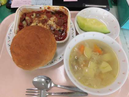 今日の給食は、 セサミパン なすのグラタン 田舎風スープ メロン です。