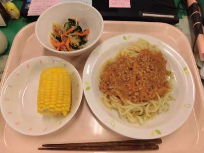 今日の給食は、ジャージャーめん 塩ナムル ゆでとうもろこし です。