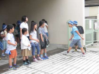 仲よし班であいさつ当番を担当する「あいさつ週間」が今年も始まりました。今年は、2年生も一緒に取り組みます。最初は61班と51班の友達が代表委員と一緒に所定の場所であいさつを行っています。天気悪い日もありますが、元気にあいさつを行っています。