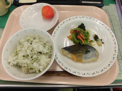 今日の給食は、じゃことあおのりのごはん さわらの梅肉焼き やさいのおかかかけ
