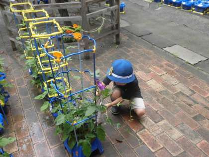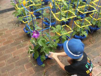 1年生が毎日お世話をしているアサガオ。今日、一輪花を咲かせました。友達が見つけて教えてあげていました。良かったですね。これからどんどん花を咲かせてくれるでしょう。