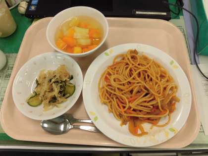 今日の給食は、スパゲティナポリタン じゃこサラダ フルーツポンチ です。