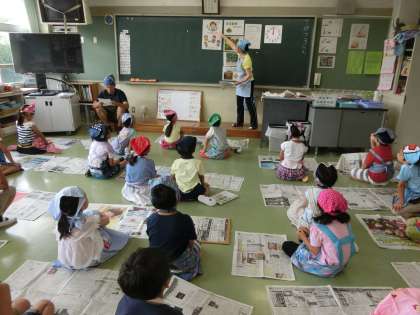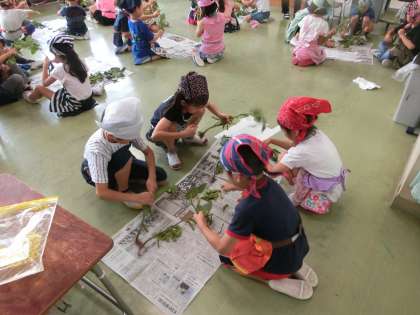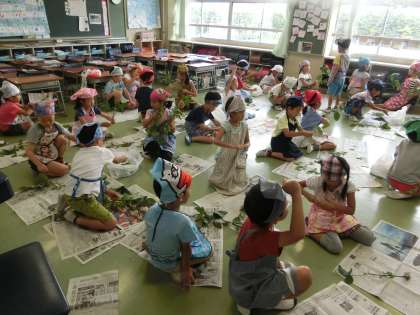 1時間目、給食メニューのえだまめに使う「さやもぎ」体験をしました。全校児童・教職員分です。エプロンと三角きんをしっかりとして、はりきってさやもぎをしました。給食のえだまめは、1年生のがんばりもプラスされ、いつもよりひと味もふた味もおいしくできあがりました。