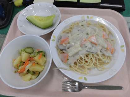 今日の給食は、スパゲティクリームソース ポテト入りフレンチサラダ メロン です。