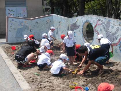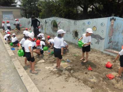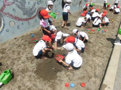 1年生が生活科の学習で砂場で遊びました。夏になり砂も気持ちよいあたたかくなり、水を流すと冷たくて気持ちよい砂の感触を楽しみました。友達と一緒に山を作ったり、穴を掘ったり、そこに水を流したり、みんなで仲良く活動しました。久しぶりの砂場遊び、十分に楽しみました。