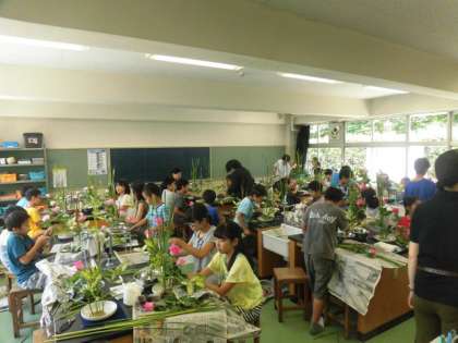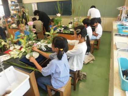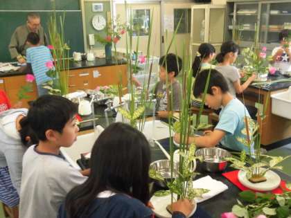 5年生が昨年度に続いて、一葉式いけ花の家元、粕谷明弘先生を講師におむかえして「華体験」を行いました。昨年度より、時間を長くした分、実際にお花を生ける様子をしっかりと見させていただくとともに、実際のいけ花の挑戦もじっくりと行うことができいました。同じ材料ですが、出来上がりがみんな違うのも面白いところです。普段できない経験に、みんな集中して取り組んでいました。行使の粕谷先生、お手伝いいただいた皆様に感謝申し上げます。ありがとうございました。